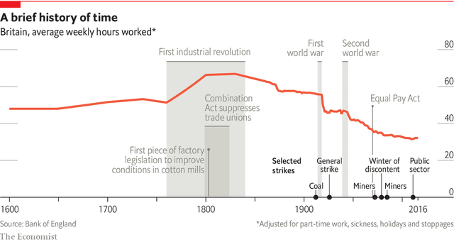 Home-workers also had more control over their time. So long as the work was done to the required standard and on time, they were not told exactly when or how to do it. That was in sharp contrast to the factory, where every aspect of life was planned in advance and workers were closely monitored. And home-workers could decide on the exact mix between work and leisure—in contrast to factory workers, who either worked the 12- or 14-hour days stipulated by the factory owner or none at all. Average working hours in the 18th century were shorter than they became in the 19th. After drinking heavily on Sunday evening, home-workers often took the day off before they went “reluctantly back to work Tuesday, warmed to the task Wednesday, and laboured furiously Thursday and Friday”, as David Landes, an economic historian at Harvard University, put it. People also got more sleep.