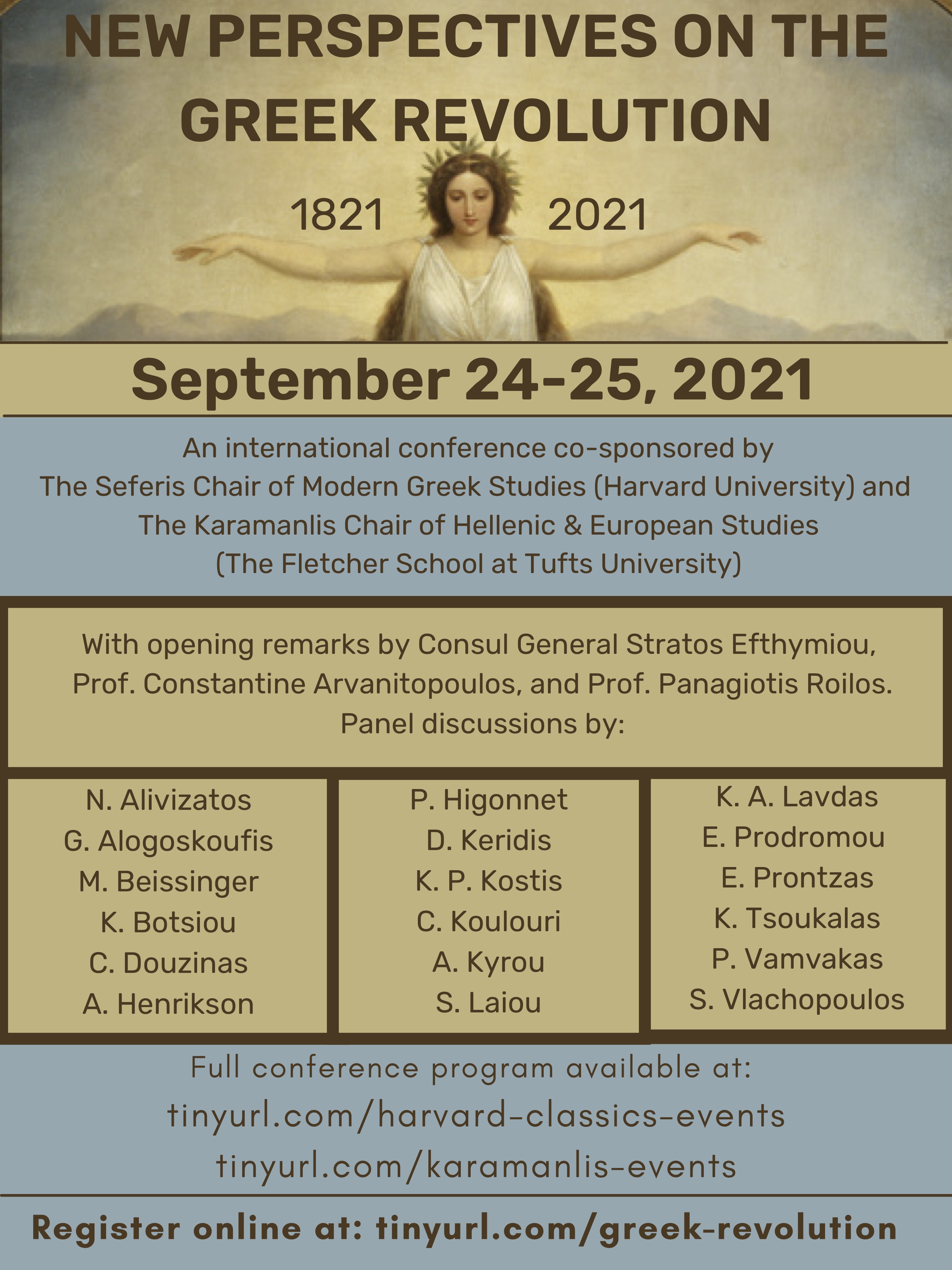 You are cordially invited to New Perspectives on the Greek Revolution: An International Conference, a two-day virtual event co-sponsored by The Seferis Chair of Modern Greek Studies (Harvard University) and The Karamanlis Chair of Hellenic & European Studies (The Fletcher School at Tufts University).