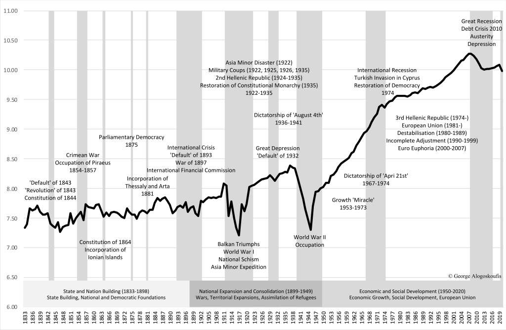 A first overview of the long-run developments of the Greek economy, based on the evolution of the Greek state, its area and population and real per capita GDP, suggests the existence of three large distinct historical cycles. (See Alogoskoufis (2021), GreeSEPaper no. 158, Hellenic Observatory, London School of Economics).
