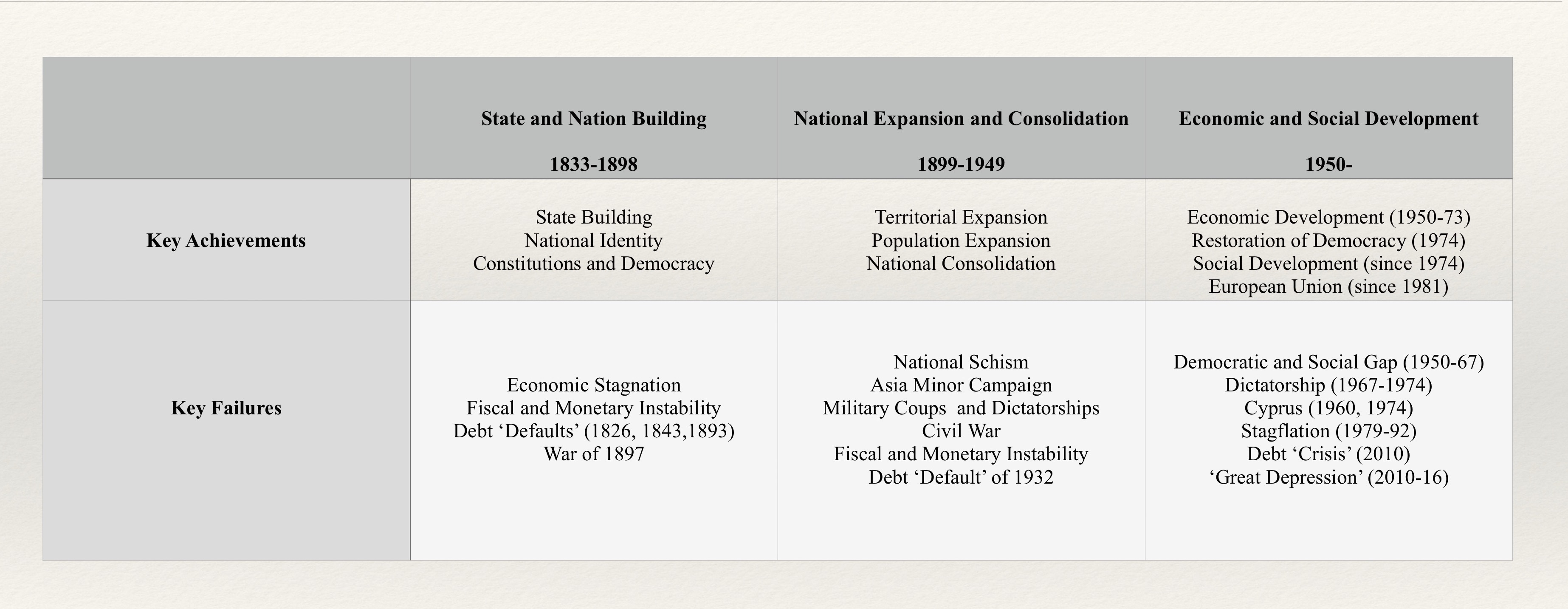 The purpose of this paper is to identify the main characteristics of these three historical cycles and analyse the key drivers of the historical evolution of the state and the economy of modern Greece.