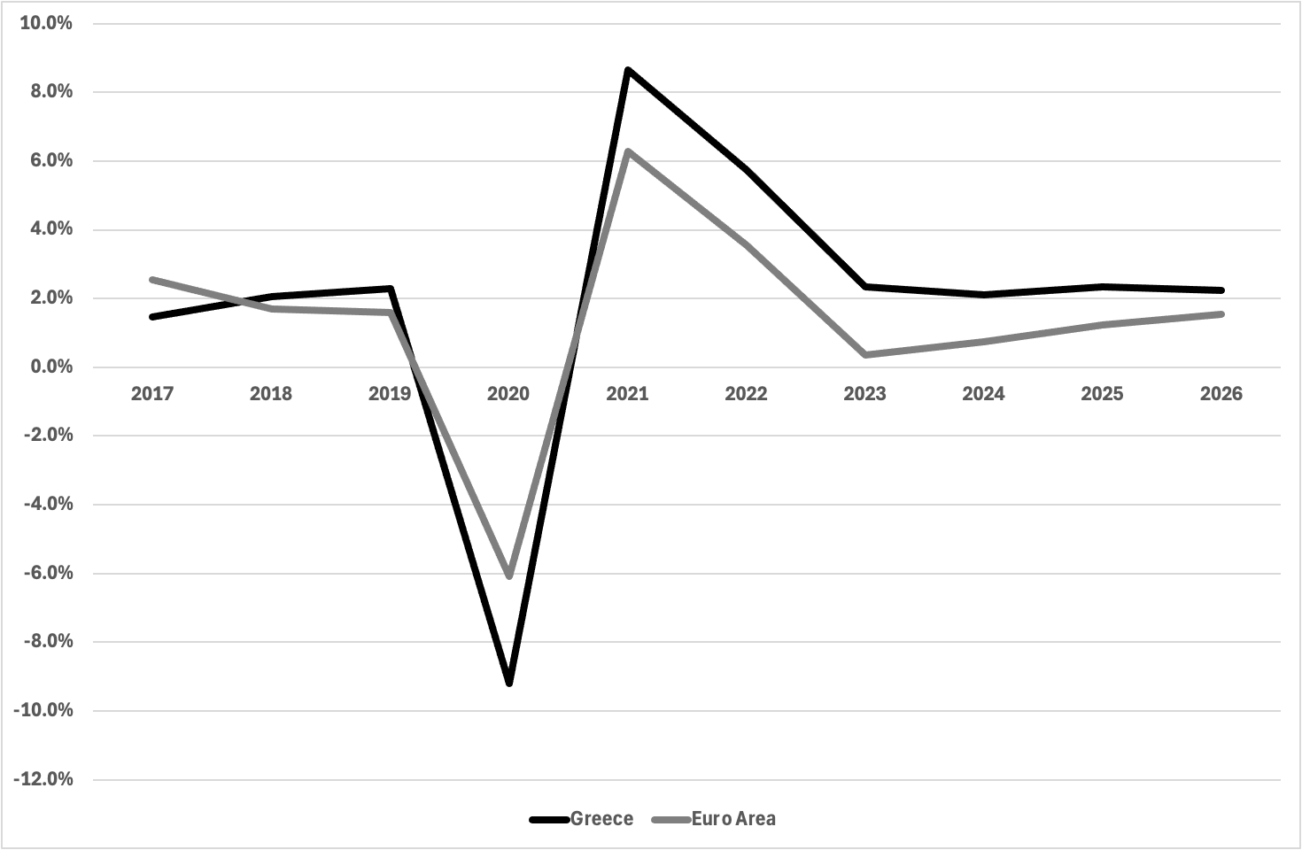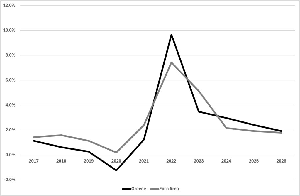 Regarding Greece, economic activity is expected to expand by 2.1% in 2024 and to maintain a broadly similar growth in 2025 and 2026, supported by the implementation of the Recovery and Resilience Plan (RRP). Unemployment, already below 10%, is expected to continue to decline but more slowly than in the past. Inflation is forecast at 3.0% in 2024 and is expected to moderate only gradually to around 2.0% by 2026.