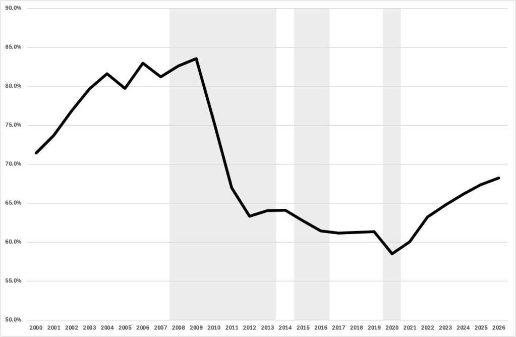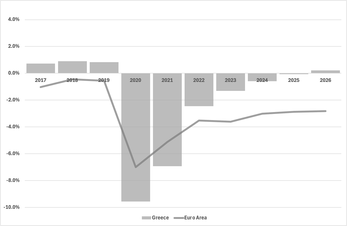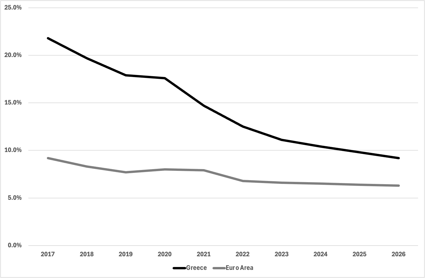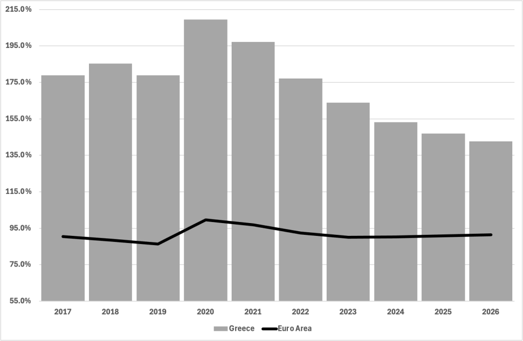 Regarding Greece, the general government deficit is projected to continue to decline due to moderate expenditure growth. Together with the steady growth of nominal GDP, this contributes to a steady reduction of the public debt-to-GDP ratio to close to 140% of GDP by 2026.