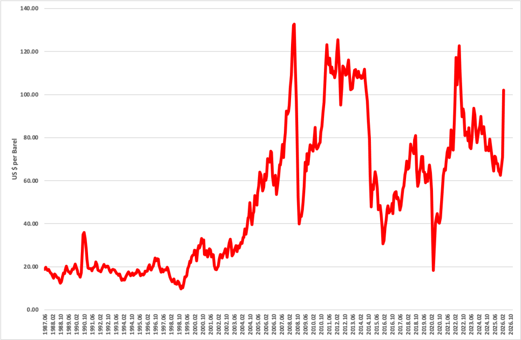 The recovery that followed was equally striking. As economies reopened in 2021 and global demand rebounded, oil prices rose rapidly. In 2022, Russia’s invasion of Ukraine introduced a new geopolitical shock. Western sanctions on Russian energy exports and disruptions to global energy flows pushed oil prices once again above $120 per barrel for a period.
